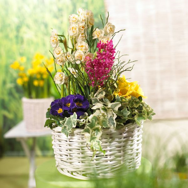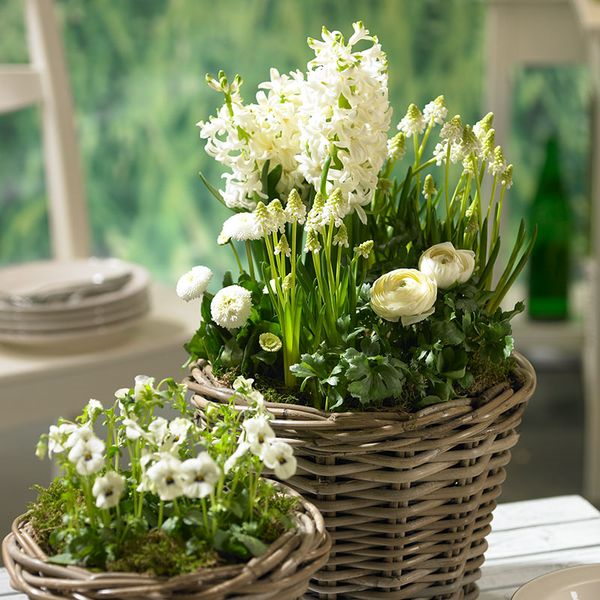 In weißer Eleganz treffen sich hier in einem Korb Hyazinthen (Hyacinthus orientalis), Traubenhyazinthen (Muscari armeniacum), Ranunkeln (Ranunculus-Hybride) und Tausendschön (Bellis perennis).