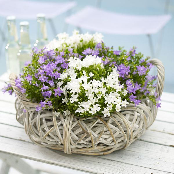 So einfach und doch so schön – ein Gefäß mit Pflanzen einer Sorte aber in verschiedenen Farben. Wie hier: die Glockenblumen (Campanula portenschlagiana) wurden in Weiß und Lila gegenüberliegend in den Korb gesetzt.