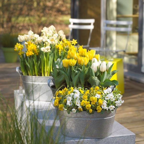 Gelb ist die wohl eindeutigste Frühlingsfarbe. In Kombination mit Weiß ist die Freude noch größer. Hier strahlen gelbe und weiße Hornveilchen (Viola cornuta), Narzissen (Narcissus-Hybride) und Tulpen (Tulipa-Hybride) in glänzenden Zinkwannen um die Wette.