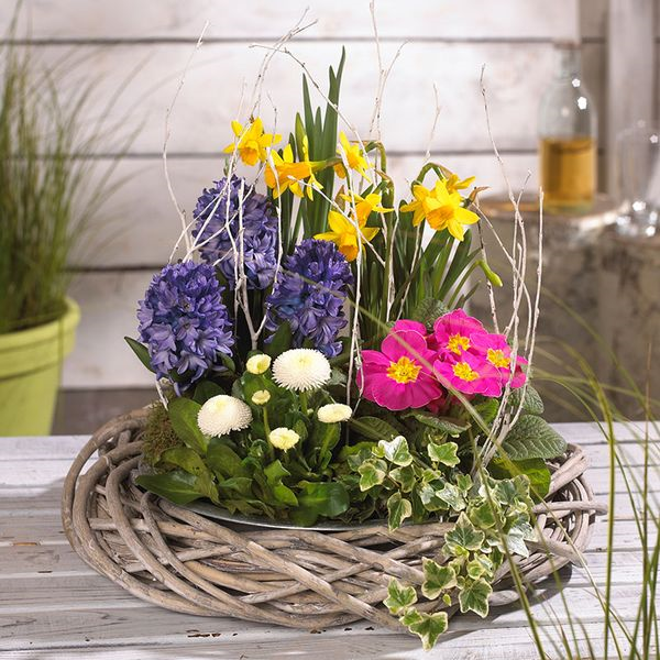 Begrüßen Sie den Frühling mit einem Feuerwerk aus Farben: Gelbe Narzissen (Narcissus-Hybride), Hyazinthen (Hyacinthus orientalis) in Blau, ein weißes Tausendschön (Bellis perennis), pinke Primeln (Primula) und ein bisschen Efeu (Hedera helix).