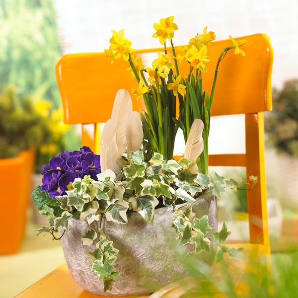 Als besonderer Hingucker können weitere Materialien, wie Federn, eingearbeitet werden. So werden schlichte Kombinationen aus Narzissen (Narcissus-Hybride), Primeln (Primula vulgaris) und Efeu (Hedera helix) ein bisschen peppiger.