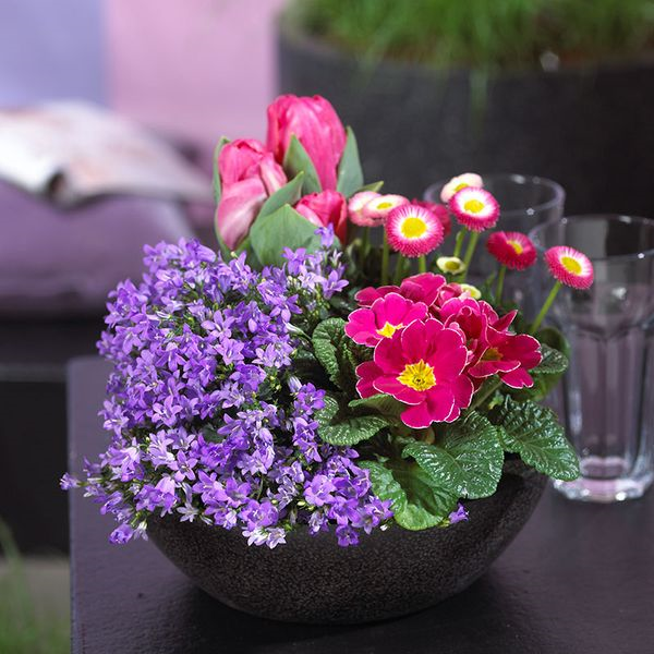 Ein Traum in romantischen Farben wird in einer modernen, schwarzen Schale zur Wirklichkeit: Tausendschön (Bellis perennis), Tulpen (Tulipa-Hybride) und Primeln (Primula vulgaris) in Pink werden im Kontrast zur blauen Glockenblumen (Campanula portenschlagiana) gesetzt.